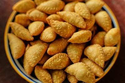 在文昌、琼海等地,糖贡、酥饺、信封饼是最为经典的年味小吃。当地人会在春节前夕炸酥饺。酥饺形似饺子,馅种类多样,各家有各家的配方,一般是将磨好的花生碎、芝麻、白糖搅拌均匀作馅,此外还有红豆馅、绿豆馅、咸味馅等。