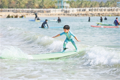 1月25日,万宁日月湾,小朋友在专业教练指导下体验冲浪。据悉,春节假期临近,海南旅游不断升温,全省各景区景点纷纷提升旅游服务质量、推出特色活动,吸引各地游客前来过暖冬、迎新春。