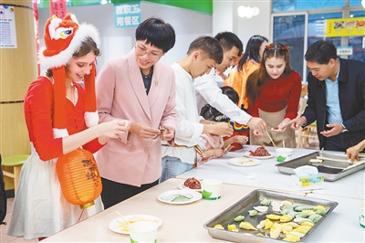 在该校的第二食堂,张灯结彩,洋溢着浓浓的年味,来自俄罗斯、塔吉克斯坦、老挝、乌兹别克斯坦等多个国家的留学生齐聚一堂,现场感受包饺子、写对联等中国春节民俗文化。