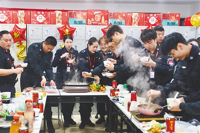 在机场地面服务部备勤室不大的空间内,部分在职的工作人员齐聚一堂,利用休憩间隙一起吃上特殊的年夜饭。