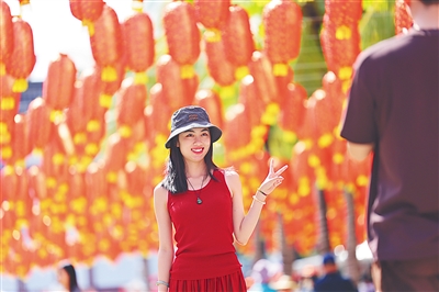 1月29日,游客在三亚南山文化旅游区内拍照留念。