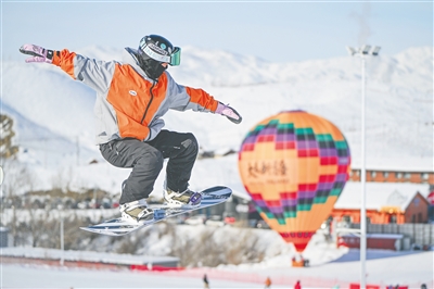 游客在新疆阿勒泰市将军山国际滑雪度假区滑雪。