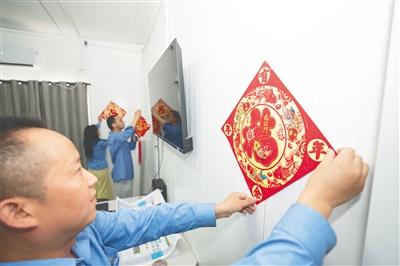 在巴西巴伊亚州乌鲁苏卡,巴西东西铁路建设项目一标段项目经理、中铁十局拉美公司总工程师银小豪在宿舍贴窗花。