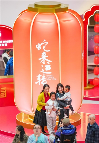 1月31日,市民游客在海口国际免税城设置的新春打卡点合影留念。海南日报全媒体记者 陈元才 摄
