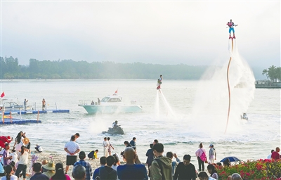 2月1日,在儋州海花岛旅游度假区,游客体验水上娱乐项目。