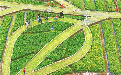 近日,在定安香草田园共享农庄,游客漫步于花丛中,亲近大自然。