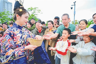 2月1日,海口海瑞文化公园举办明韵古风巡游活动,图为游客与演职人员互动。海口市旅文局供图