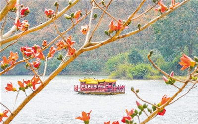 2月3日,在昌江黎族自治县七叉镇尼下村,游客乘船畅游昌化江,欣赏绽放的木棉花。