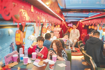 2月2日,游客坐在老爸茶·海口巴士上品尝美食,欣赏沿途美景。为了丰富春节假期市民游客文化生活,海口开通了老爸茶·海口巴士蛇年“行”好运专班。
