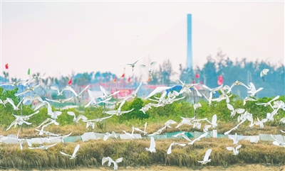 近日,儋州市白马井镇禾囊村的一处池塘里,一群白鹭陆续回巢。鹭鸟成群结队觅食、飞翔,成为冬日一道独特风景。 海南日报全媒体记者 陈元才 摄