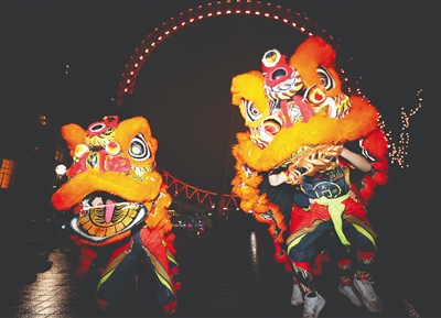 在英国首都伦敦,演员在亮起红色灯光的地标建筑“伦敦眼”前表演舞狮。