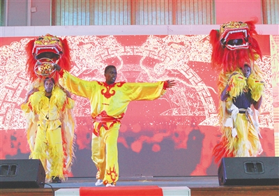 在津巴布韦首都哈拉雷举行的华侨华人新春庙会活动上,津巴布韦青年舞狮团进行舞狮表演。