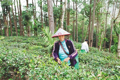 2月4日,立春刚过。五指山水满乡番响村印象水满茶园,梯田间,成片大叶茶郁郁葱葱,长势喜人。茶农背着竹篓穿梭其间熟练地采撷着春节后第一批早春茶。