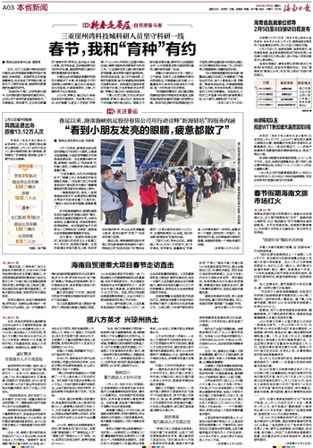 “如今海南高度重视科技创新,南繁硅谷建设为科研工作者搭建了干事创业的平台,每个人都是奋斗者、贡献者。”熟练地完成实验,刘袁媛稍微整理了白大褂,快步走向电梯,三楼实验室的工作还在等着她。实验室内,火热的工作场景与热闹的新春氛围交织,这个春节,假期科研“不打烊”。