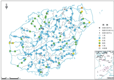 全省地表水水质总体为优,192个1省控监测断面(点位)的水质优良(Ⅰ~Ⅲ类)比例为96.9%,同比上升1.0个百分点;无劣Ⅴ类断面,同比持平。19个市县中,文昌市水质轻度污染,东方市水质良好,其余市县水质为优。