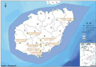近岸海域水质和主要森林旅游区空气负离子水平示意图