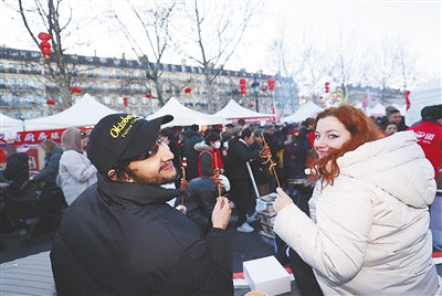 人们在法国巴黎共和国广场举行的旅法华侨华人春节庙会及美食节上品尝美食。新华社发