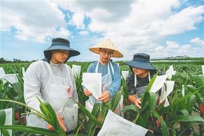 海南农垦高值优质经济作物新品种成果中试基地里,广东省农科院玉米育种专家带领团队为玉米材料授粉。