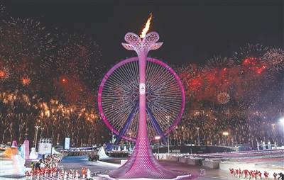 ② 2月7日,焰火在开幕式分会场上空绽放。新华社记者 李一博 摄