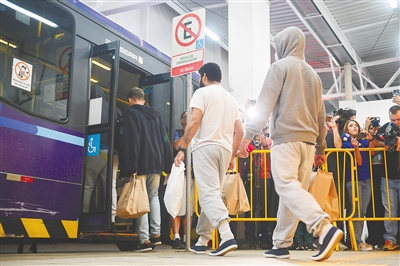 2月7日,被美国驱逐出境的巴西非法移民在巴西塞阿拉州福塔莱萨的国际机场乘坐客车。新华社/法新