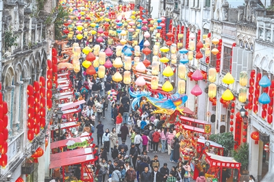 ① 2月8日,春节过后,海口骑楼老街热度不减,市民游客沿着街道逛灯展、品美食,感受椰城浓浓的烟火气。