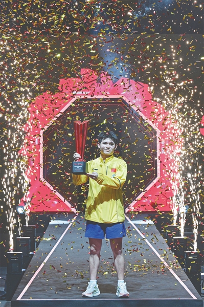 本报海口2月9日讯(海南日报全媒体记者王黎刚)2月9日晚,世界乒乓球职业大联盟(WTT)新加坡大满贯赛男单决赛在新加坡体育中心进行。海南籍国手林诗栋以4:2击败队友梁靖崑,夺得冠军,并赢得了7.5万美元的奖金。这是他在本次比赛中赢得的第三个冠军,此前他已获混双和男双冠军。这场决赛一开始就打得十分激烈,两人比分始终紧咬,梁靖崑凭借强势发挥以11:9先下一城。次局,林诗栋调整战术,以11:8追回一局。此后两局,双方各胜一局,战成2:2平。此后,林诗栋掌控局面,先后以11:3和11:2再胜两局,夺得男单冠军。加上此前收获的混双和男双冠军,林诗栋成为本次赛事“三冠王”。