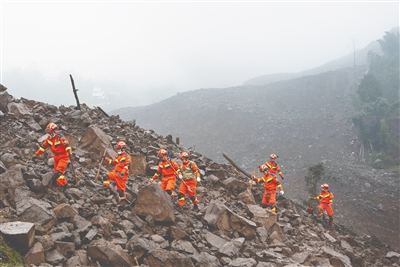9时,记者来到滑坡救援现场,山区雨雾蒙蒙,十分阴冷。在滑坡带底部,已有多台挖掘机在作业,巨大的轰鸣声响彻山谷。现场被划分为十个搜救网格,救援人员全力开展搜寻。