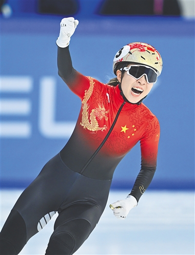 虽然还没滑过终点,但公俐已经开始振臂庆祝这枚宝贵的金牌了。