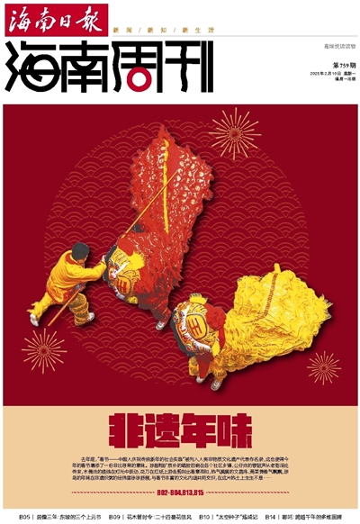 去年底,“春节——中国人庆祝传统新年的社会实践”被列入人类非物质文化遗产代表作名录,这也使得今年的春节增添了一份非比寻常的意味。琼剧粗犷质朴的唱腔回响在各个社区乡镇,公仔戏的锣鼓声从老街深处传来,木偶戏的提线在灯光中跃动,花刀在红纸上游走剪刻出春意祥和,热气腾腾的文昌鸡、斋菜煲香气飘飘,琼岛的年味在非遗织就的经纬里徐徐舒展,与春节丰富的文化内涵共同交织,在这片热土上生生不息……B02-B04,B13,B15