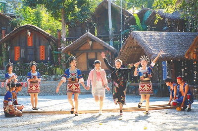 1月24日春节前夕,一场黎族打柴舞展演在三亚海旅免税城举办,打柴舞的竹竿随歌起落,引起一阵阵掌声与喝彩。