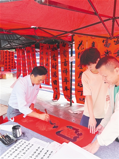 春节前夕,在乐东黎族自治县黄流镇,当地书法爱好者在街边创作大量楹联作品,洋溢着浓浓的年味。受访者供图
