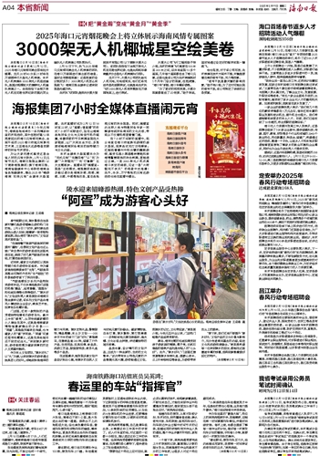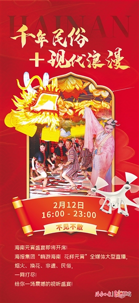 本报海口2月10日讯(海南日报全媒体记者蔡曼良)今年元宵节,海南各地将举办一系列精彩纷呈的庆祝活动,其中包括时隔13年再度回归的海口元宵烟花晚会、全面升级的2025海口府城元宵换花艺术周、三亚海岛大巡游等备受期待的民俗节庆项目。为让大家沉浸式感受这场全省人民的元宵大联欢,2月12日元宵节当天,海南日报报业集团(以下简称海报集团)旗下海南日报、海南省融媒体中心将联动海南全省各地融媒体,推出2025年“嗨游海南 花样元宵”全媒体大型直播。此次直播时间为2月12日16时至23时,以“直播+慢直播”的形式7小时不间断进行,旨在让海南各地民俗文化与元宵佳节热烈碰撞,将最浓郁的节日氛围呈现在大家眼前,让广大网友全方位、多角度领略海南民俗背后的独特魅力与文化内涵。