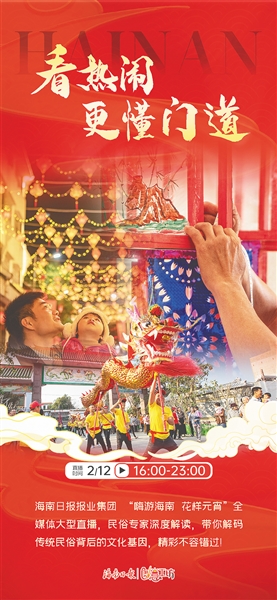 本报海口2月11日讯(海南日报全媒体记者蔡曼良)2月12日16时,海南日报报业集团旗下海南日报、海南省融媒体中心将携手全省各地融媒体,重磅启动2025年“嗨游海南 花样元宵”全媒体大型直播。此次全媒体大型直播跨越山海,全岛联动,以“直播+慢直播”的形式,7小时不间断为大家呈现海口、三亚、儋州、万宁、琼海、屯昌、乐东等多个市县的节庆盛景,多种民俗活动交相辉映,引领观众沉浸式体验浓郁的节日氛围,领略琼岛多地别具一格的元宵风情。
