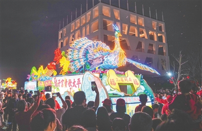在乐东黎族自治县黄流镇,花灯彩车流光溢彩。“祝福祖国”“春回大地”“福满人间”“年瑞果香”“蛇年大吉”……今年的黄流花灯巡游规模宏大,共有17辆造型各异的花灯彩车。