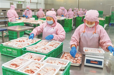 2月13日,海南(潭牛)文昌鸡股份有限公司的生产加工车间,工作人员在分装文昌鸡。该公司是农业产业化国家重点龙头企业,近期文昌鸡市场需求激增,该公司全体员工加班加点赶订单,日均产量达2万只,全力保障市场供应。海南日报全媒体记者 袁琛 摄