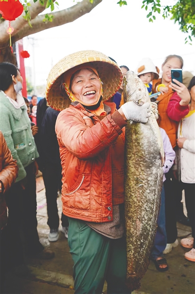 2月11日,在第六届“才存乡村渔乐节”上,村民展示自己捕到的大鱼。