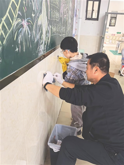 图③ 2月16日,海口市五源河学校三年级七班的家长和学生在打扫卫生。受访者供图