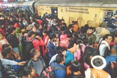 2月15日,人们在印度首都新德里火车站乘坐火车。新华社发