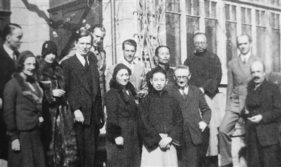 刘天华(后排右二)与梅兰芳、齐如山等一起接待法国音乐家。