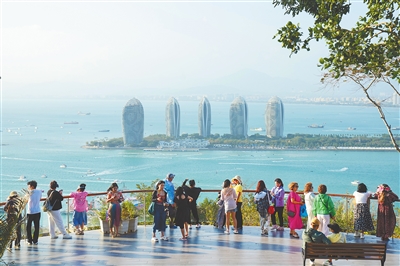 2月20日下午,众多游客在三亚鹿回头风景区观赏三亚城市风光美景。