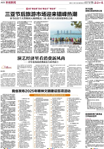 本报三亚2月20日电(海南日报全媒体记者刘杰)春节假期过后,三亚旅游市场依旧火热,各景区景点游客络绎不绝。连日来,三亚紧抓错峰出游“窗口期”,不断推出新的旅游产品,开展丰富的文旅活动,并提供优质旅游服务,进一步丰富游客旅游体验,努力把春节“黄金周”变为“黄金月”“黄金季”,延续旅游市场“开门红”。2月20日,随着航班缓缓落地,三亚迎来2025年春节后的首个大型韩国入境团。近200名韩国游客将前往天涯海角、亚龙湾热带天堂森林公园、三亚千古情等景区景点,开启一段深度体验之旅。
