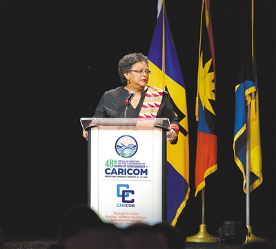 加勒比共同体(加共体)轮值主席、东道国巴巴多斯总理莫特利在加共体第48届政府首脑会议开幕式上发言。新华社发