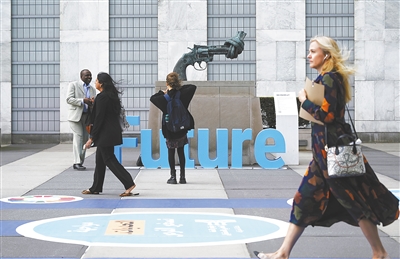 在位于纽约的联合国总部,人们从联合国未来峰会会场外走过。新华社发