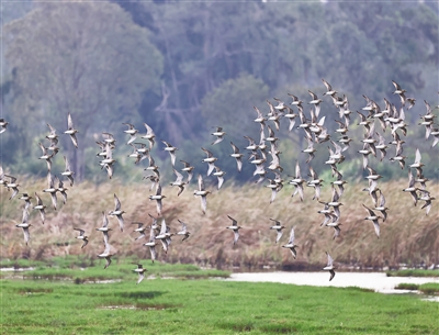 “今年2月,我们监测到比较可喜的金鸻数据,它们很喜欢群居。”2月19日上午,海尾湿地公园管理中心副主任薛美丽举起长焦相机,捕捉一群盘旋在公园湿地上空的金鸻。