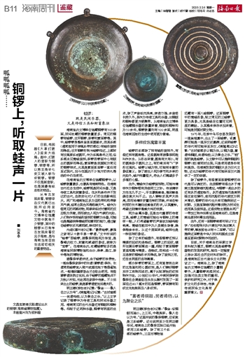 从考古发现来看,铜锣早在汉代就已出现并沿用至今。海南省内文博单位馆藏文物中就有不少铜锣,其中的蛙锣从已有考古发现来看仅见于海南,是与海南当地百姓生活密切相关的重要物品。