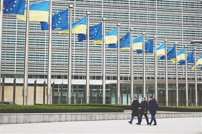 2月24日,在比利时布鲁塞尔,人们走过欧盟总部。新华社发