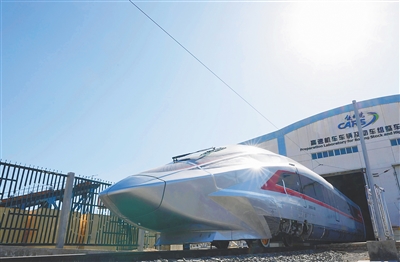 近日,运营时速400公里的高铁列车CR450动车组样车在北京发布。目前相关团队正在开展一系列科学试验和性能验证,为动车投入商业运营创造条件。图为在铁科院国家铁道试验中心接受试验验证的CR450动车组样车。新华社发