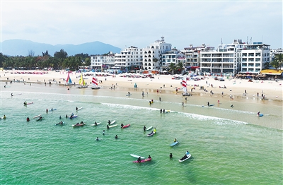 2月27日,三亚市海棠区皇后湾海域,众多游客前来冲浪,在大海中尽情驰骋。海南日报全媒体记者 王程龙 摄