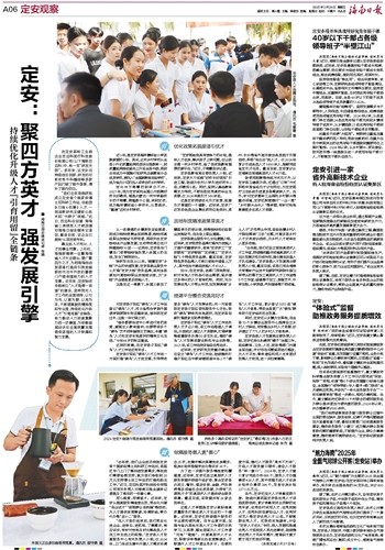 用心施策、用情留才。近年来,定安从提高服务精准度出发,常态化开展“走企访才”“我陪群众走流程”等活动,为人才提供政策解读、协调联络、帮办代办等“店小二”服务。