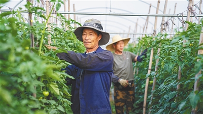 在海南农垦南繁番茄标准化种植示范基地,农户为番茄修枝。